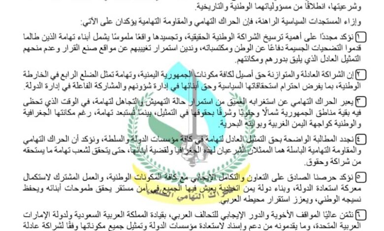 وإزاء المستجدات السياسية الراهنة، فإن الحراك التهامي والمقاومة التهامية يؤكدان على الآتي: