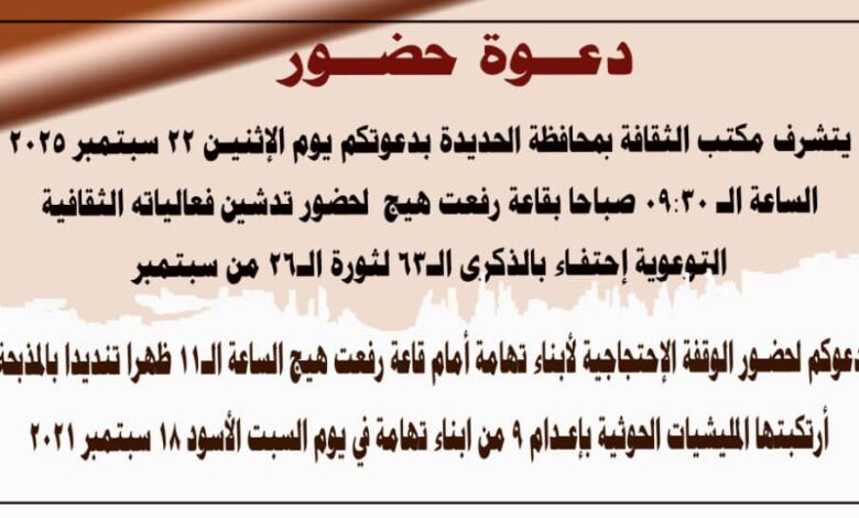 مكتب الثقافة بالحديدة يدعو إلى حضور فعاليات إحياء مناسبة ثورة 26 سبتمبر