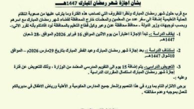 أصدر مكتب التربية والتعليم بالعاصمة المؤقتة عدن تعميمًا إداريًا بشأن إجازة شهر رمضان المبارك للعام الدراسي 2025–2026م. وقضى التعميم بإيقاف…